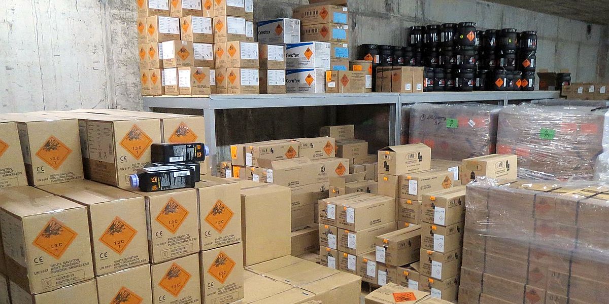 An operator uses a handheld computer to scan each box at the end of the production and transfer it to a location in a magazine. The handheld computers operate in batch mode as there is no WiFi in the magazines. To ensure the 'explosive quantity' is within the official limit for the magazine the handheld computer have a record of every item it contains.