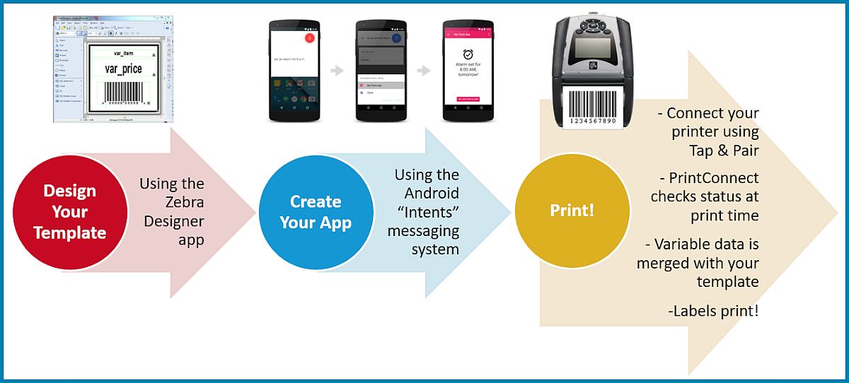 PrintConnect handles the discovery and pairing process with Zebra Link-OS printers via Bluetooth or WLAN connections. This reduces app code required.