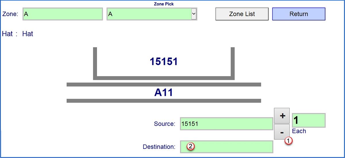 Pick one item from bin 15151 at A11 (zone A, location 11). Picker: scan barcode on bin (Source), confirm/reduce quantity (1), scan barcode on box (Destination)(2) to submit. System: check Source and Destination have the right parts. Smarts: to customise process.
