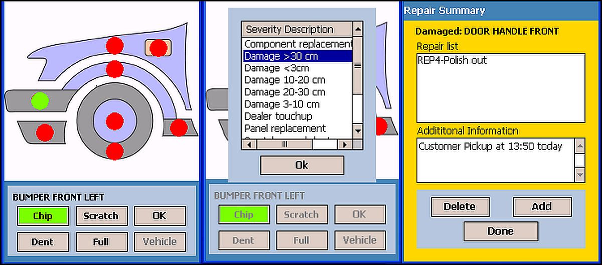 Three data entry screens showing how an inspector recorded damage to a front bumper and ordered a repair to a front door handle