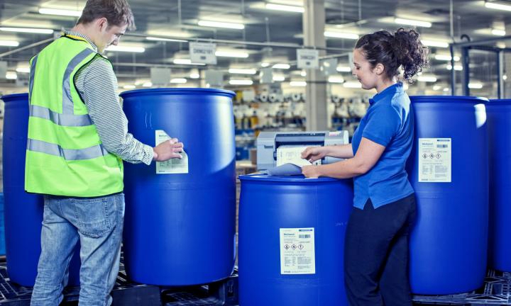 An industrial colour printer for GHS and large format chemical drum labels.