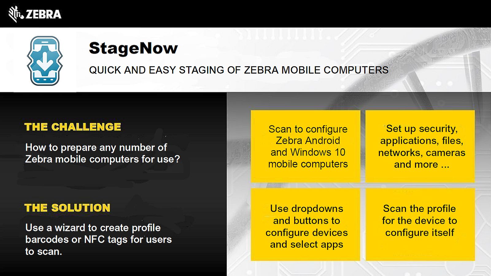 - StageNow – Quickly stage Android devices with a bar code scan or an NFC tag tap