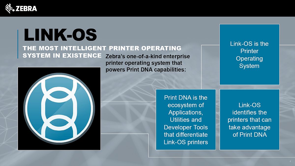Link-OS is Zebra's printer operating system. Link-OS printers are easy to integrate, manage and maintain from any location. They are intelligent, mobile and connect to the cloud.