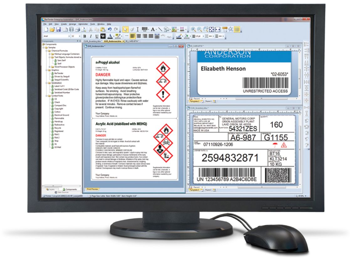 - Design and print labels, cards, mag stripe cards and more.